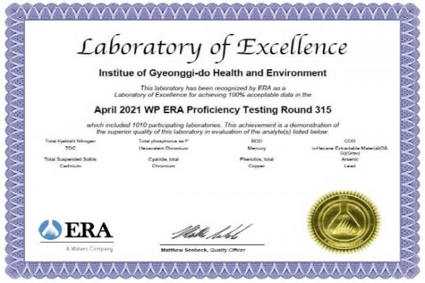 ISO(국제표준화기구) 인증을 받은 국제숙련도 시험기관인 미국 환경자원학회(ERA)가 주관한 올해 평가에서 경기도보건환경연구원은 일반수질오염 물질인 ▲유기물질 ▲영양물질 ▲대장균군 등 10개 항목과 특정수질유해물질인 ▲벤젠 ▲클로로포름 ▲수은 등 10개 항목 등 20개 항목 모두에서 최고등급인 ‘만족(Satisfactory)’을 받아 ‘최우수 분석기관’으로 선정됐다.