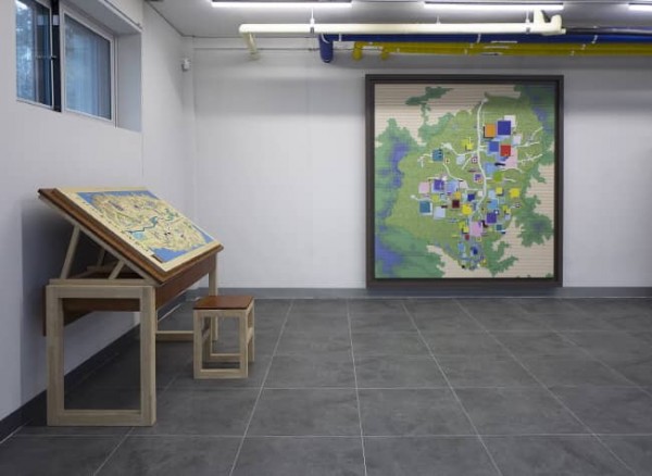 ‘기억을 깨우는 마을지도’는 성남의 자연 하천을 각기 다른 방식으로 시각화한 작품이다. ‘기억을 깨우는 마을지도 Ⅰ’은 상공에서 위성으로 바라본 현재의 성남을 배경으로 개성이 다른 두 작가가 협업을 통해 새롭게 해석한 이미지 지도다. 사실적인 지도 위에 도시의 풍경을 디지털 세대의 패턴과 감수성, 기하학적 형태로 재구성해 도시화 현상을 보여준다. ‘기억을 깨우는 마을지도 Ⅱ’는 도심지 개발로 변형되거나 사라진 복개천의 옛 모습을 복원했다. 고지도의 시점을 대하듯 과거 탄천의 지천들 지형적 특성과 지역 주민들의 인터뷰 기록 등을 시각화한 작업이다. 특히 시민들의 인터뷰 내용을 작품 서랍 속에 보관해 관람객들이 자세한 지역의 이야기를 접하고 자신의 이야기를 함께 기록할 수도 있게 했다.