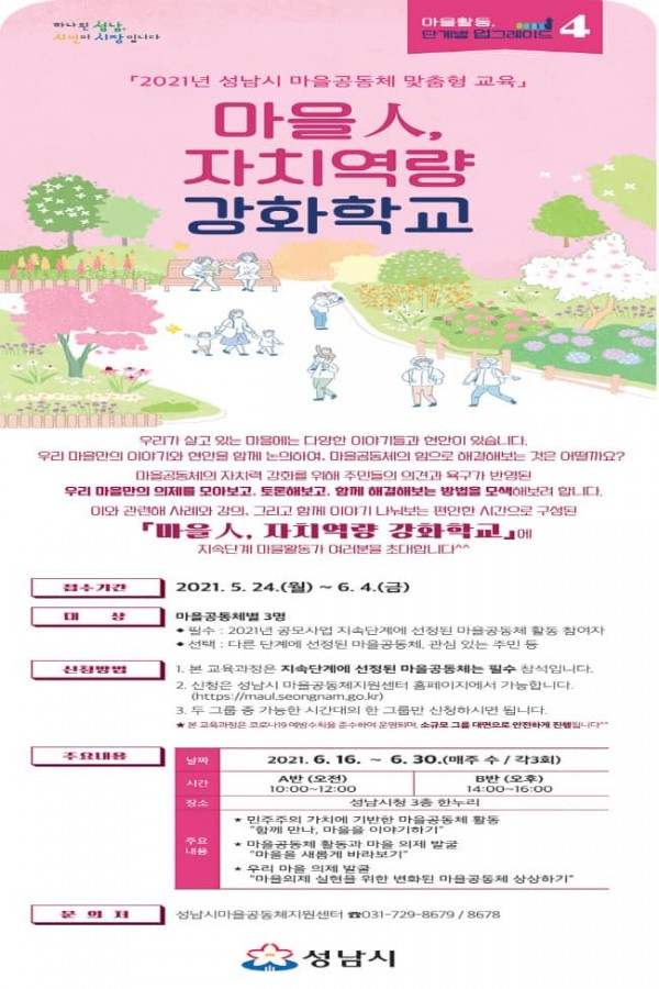 성남시(시장 은수미)는 마을공동체의 성장단계에 따라 단계별 맞춤형 교육사업을 추진하며, 이 사업의 일환으로 「성남시 마을人, 자치역량 강화학교」를 진행한다고 9일 밝혔다.