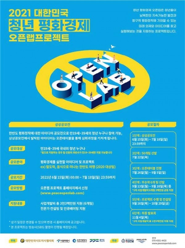 공모에 참가를 원하는 청년은 오는 6월 15일부터 내달 18일까지 오픈랩 프로젝트 공식 홈페이지(www.peaceopenlab.com)를 통해 자신의 아이디어를 제출하면 되며, 개인 또는 단체로 참여할 수 있다.