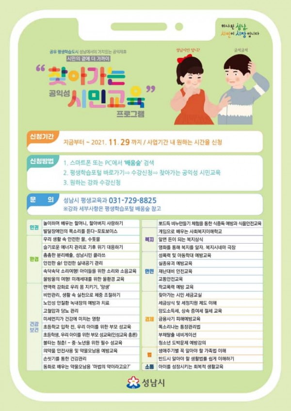 시는 이번 시민교육을 위해 을지대학교, 성남시의사회, 성남소비자시민모임, 성남환경운동연합 등 21개 기관·단체와 협업하며, 일부 강좌는 비대면 교육을 병행한다. 시민교육에 참여하려면 성남시 평생학습 포털 ‘배움숲’을 통해 온라인 신청하면 된다. 별도 수강료는 없다.