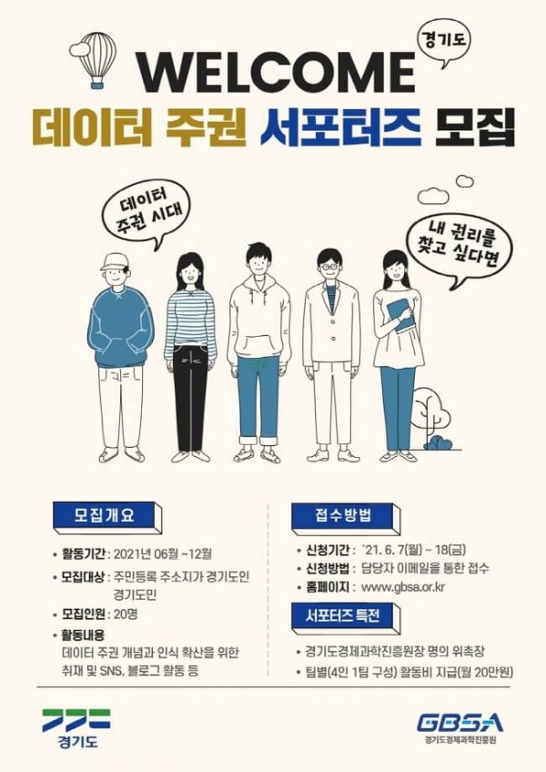 경기도가 데이터 주권에 대한 인식개선과 확산을 선도할 ‘데이터 주권 서포터즈’ 20명을 오는 18일까지 모집한다.