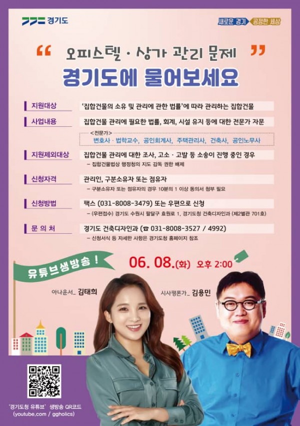 경기도가 6월 8일 오후 2시 오피스텔, 상가 등의 관리 정보를 제공하기 위해 ‘집합건물 온라인 토크쇼’를 생방송으로 진행한다.