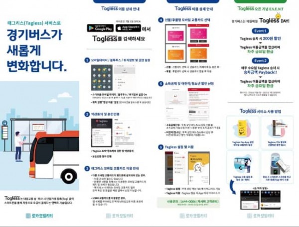 ‘비접촉 요금결제 서비스’는 스마트폰에 ‘태그리스 페이-앱’을 설치 후 선·후불형 교통카드를 등록하면, 버스 승하차 시 교통카드 단말기에 별도 카드 접촉(태그)없이 자동으로 승하차 처리 및 결제가 이루어지는 서비스다.