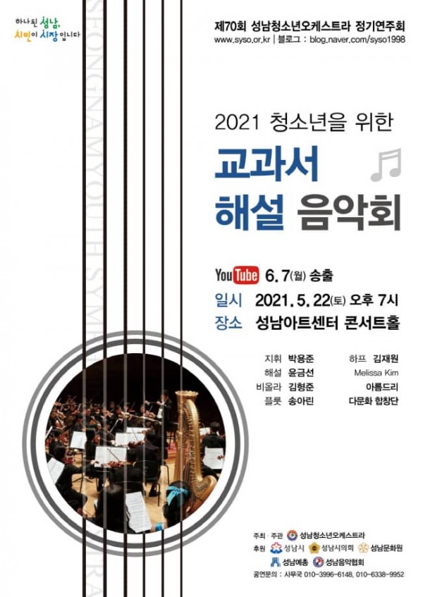 한국예술비평가협회 청소년오케스트라 대상(大賞)을 수상한 바 있는, 성남청소년오케스트라(감독 겸 상임지휘자 박용준)가 주최하는, ‘2021 청소년을 위한 교과서 해설음악회’가 5. 22(토) 오후7시 성남아트센터 콘서트홀에서 개최된다.