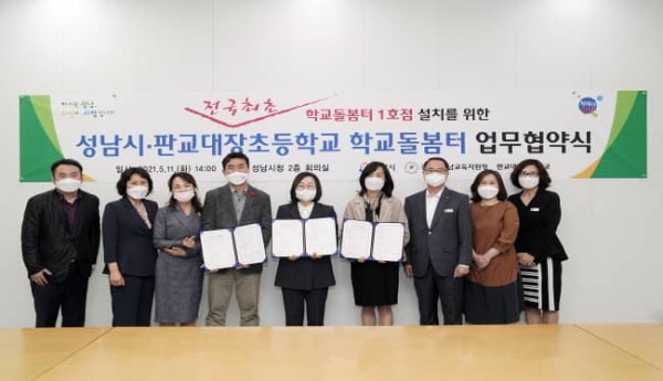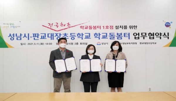 시는 5월 11일 오후 2시 시청 2층 회의실에서 은수미 성남시장과 이범희 경기도성남교육지원청 교육장, 권영선 판교대장초등학교장 등이 참석한 가운데 ‘학교돌봄터 설치·운영에 관한 업무 협약’을 했다.
