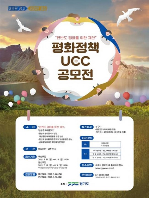 접수기간은 5월 31일부터 6월 18일까지로, 자세한 사항은 평화정책 UCC 공모전 홈페이지(www.ggpeace.com)에서 확인할 수 있다.