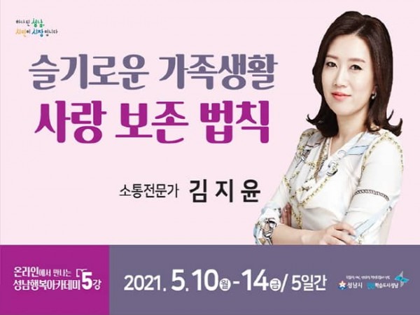 성남시는 5월 가정의 달을 맞이하여 성남행복아카데미 강연 다섯 번째 이야기로 김지윤 소통전문가를 초청 “슬기로운 가족생활, 사랑 보존 법칙”이라는 주제로 5월 10일 부터 5월 14일까지 5일간 유튜브 ‘성남TV’를 통해 시민들과 만나는 자리를 마련한다.