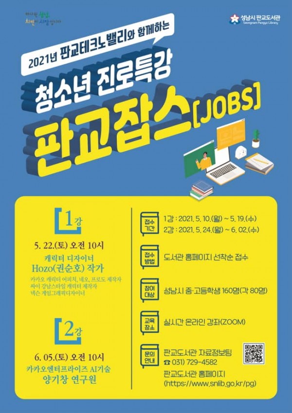 판교도서관 관장은 “판교테크노밸리와 함께하는 청소년 온라인 진로특강 판교잡스(JOBS)를 통해 청소년들이 미래직업에 대한 살아있는 정보를 얻고, 구체적인 꿈을 키울 수 있기를 바란다.”라고 밝혔다.
