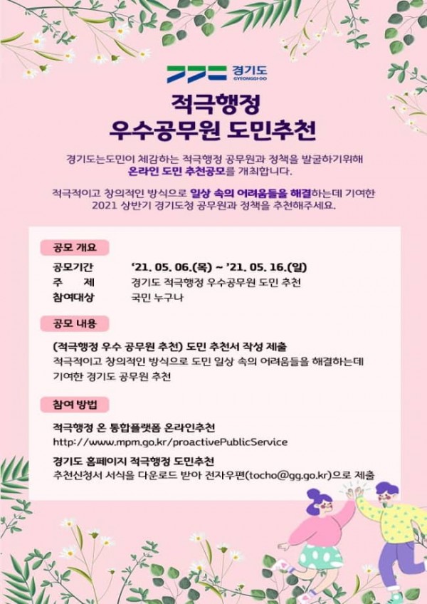 경기도가 ‘2021년 상반기 적극행정 우수공무원 선발’을 위해 적극행정을 실행한 공무원과 우수정책 등을 도민이 직접 추천하는 온라인 도민 추천 공모를 실시한다.