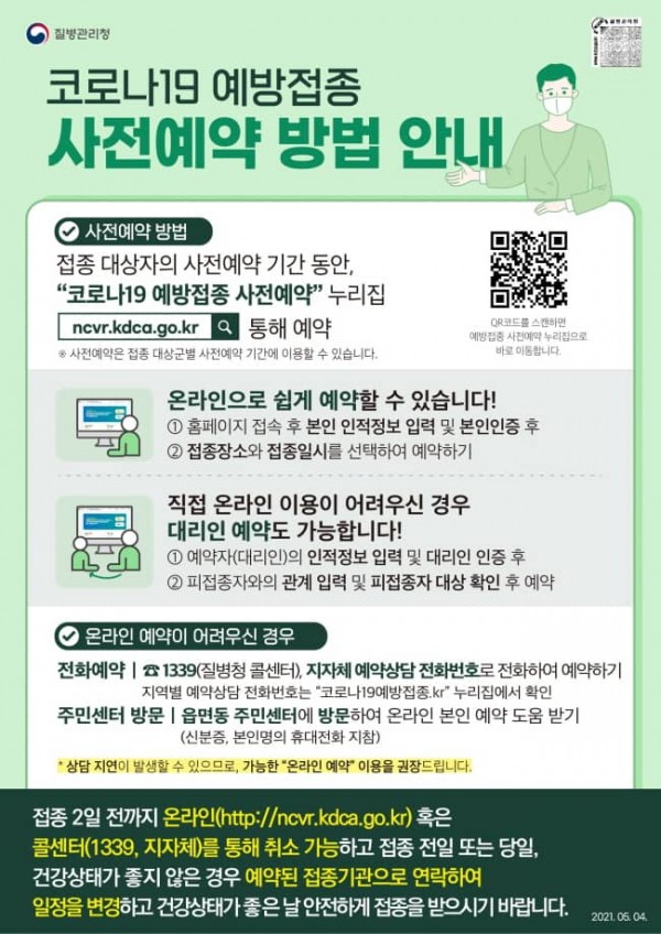 ○ 예방접종 사전예약은 온라인 누리집 및 질병관리청 콜센터(1339)