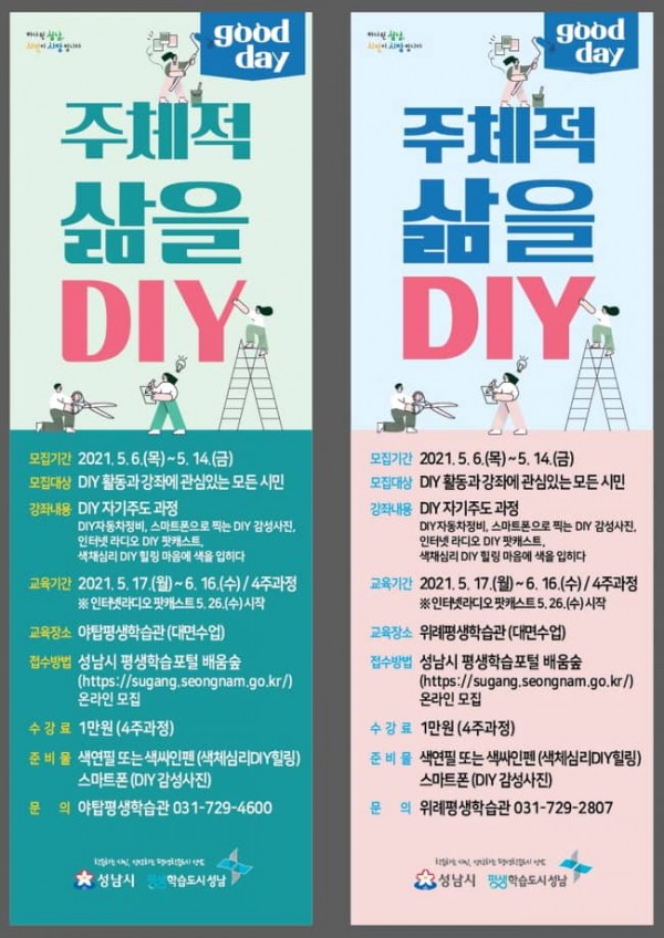 성남시(시장 은수미)는 오는 5월 17일부터 6월 16일까지 자동차 정비, 스마트폰으로 찍는 감성 사진, 인터넷 라디오 팟캐스트, 색채 심리 등 4개 강좌의 ‘DIY 자기 주도과정’을 운영한다.