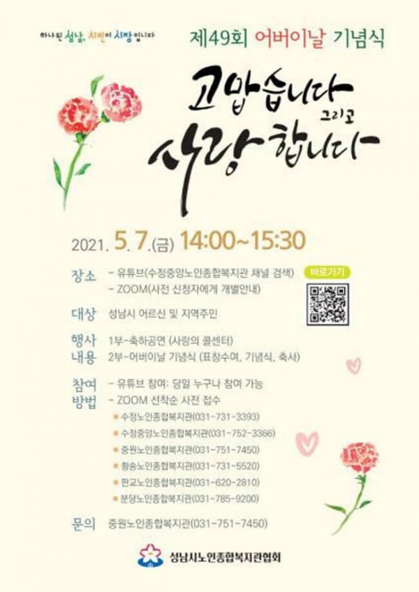 성남시노인종합복지관협회(회장 김진권)가 주관하는 이날 행사는 수정중앙노인종합복지관 유튜브로 생방송 해 시민 누구나 시청할 수 있다.