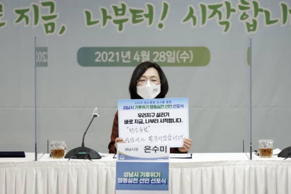성남시(시장 은수미)는 4월 28일 오전 10시 30분 시청 한누리에서 2050년까지 탄소 중립 도시 만들기 위한 ‘기후 위기 행동실천 선언’ 온·오프라인 선포식을 했다.