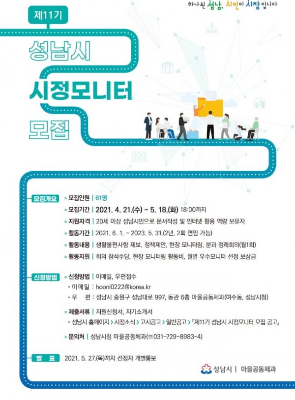 성남시(시장 은수미)는 오는 5월 18일까지 ‘제11기 성남시 시정모니터’로 활동할 시민 61명을 모집한다.