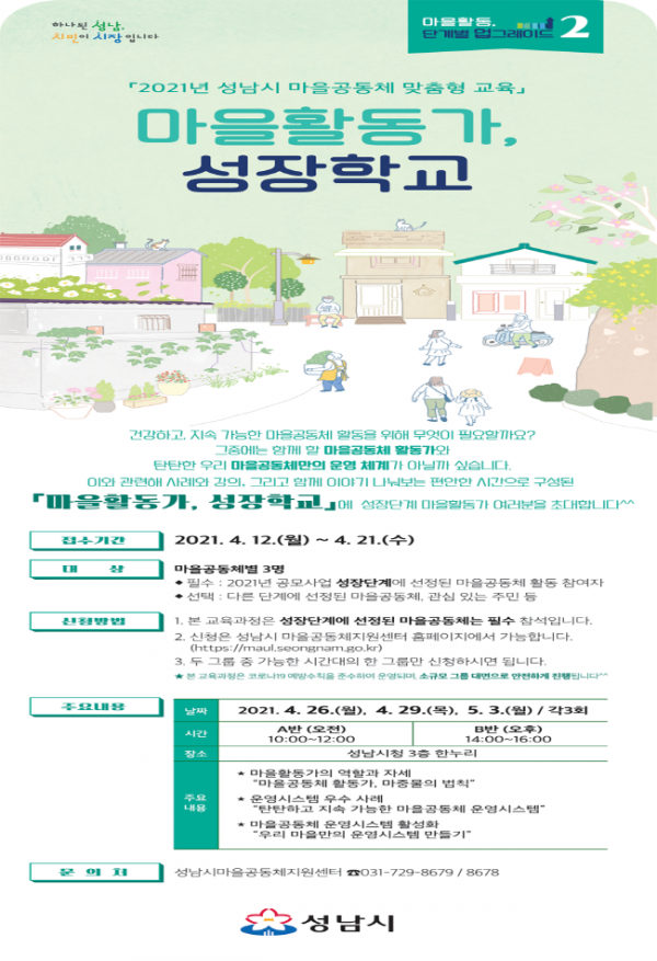 성남시 마을공동체과장은 “앞으로도 체계적인 마을공동체 맞춤형 교육과 다양한 지원사업들로 지역 곳곳에서 마을공동체가 건강하게 활동할 수 있도록 최선을 다하겠다.”고 말했다.