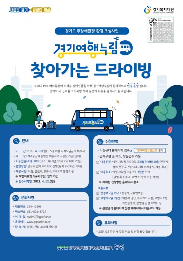 도는 사회적 거리두기 단계 완화 시 ‘경기도 무장애 관광 환경 조성사업’인 ‘경기여행누림버스’와 ‘溫(온)동네경기투어버스’도 함께 운영할 계획이다. 경기여행누림버스는 휠체어 탑승 가능한 대형버스(휠체어 8석, 일반 21석) 2대를 도내 관광을 희망하는 장애인에게 무료로 대여하는 것이며, 온동네경기투어버스는 전국 등록 장애인 및 동반자를 대상으로 격주 토요일마다 도내 주요 관광지를 운행하는 서비스다.