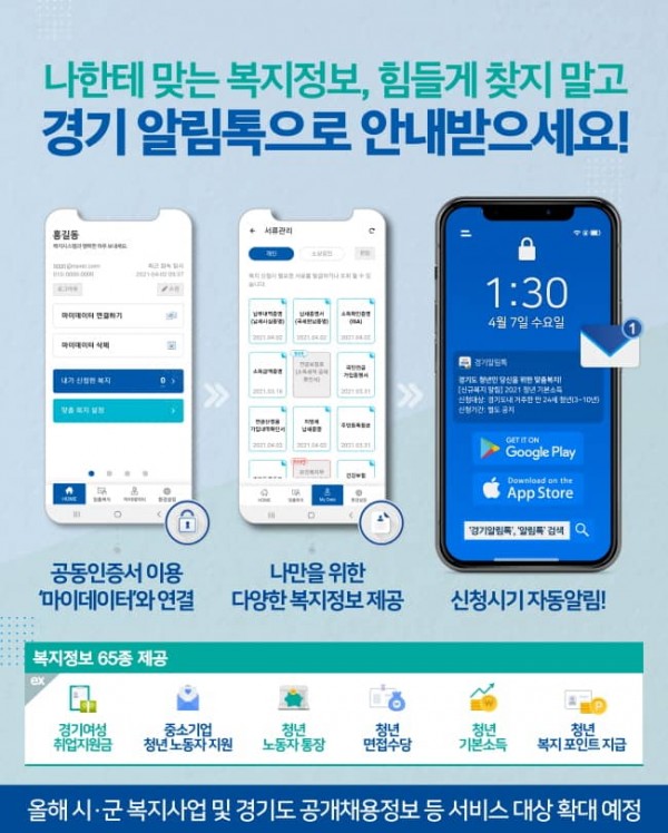 ○ 올해 ‘경기알림톡’ 서비스 대상을 경기도 뿐만 아니라 시군의 모든 개인수혜정책과 경기도 공개채용정보로 확대하고 행정안전부 ‘공공마이데이터’와 연계해 신청서류를 최소화하는 지원도 함께 추진할 계획