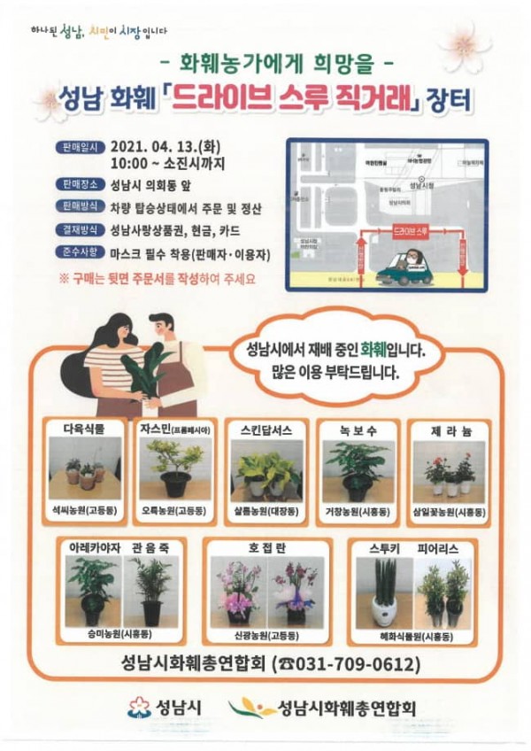 성남시(시장 은수미)는 코로나19 장기화로 어려움을 겪는 화훼농가의 판로지원을 위해 오는 4월 13일 오전 10시 시의회 건물 앞에서 ‘화훼 드라이브 스루 직거래 장터’를 연다.