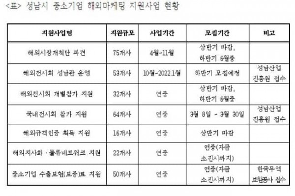 시행사업은 해외시장개척단 파견, 해외전시회 성남관 운영, 해외전시회 개별참가 지원, 국내전시회 참가 지원, 해외규격인증 획득 지원, 해외 지사화·물류네트워크 지원, 수출보험(보증)료 지원 등이다.