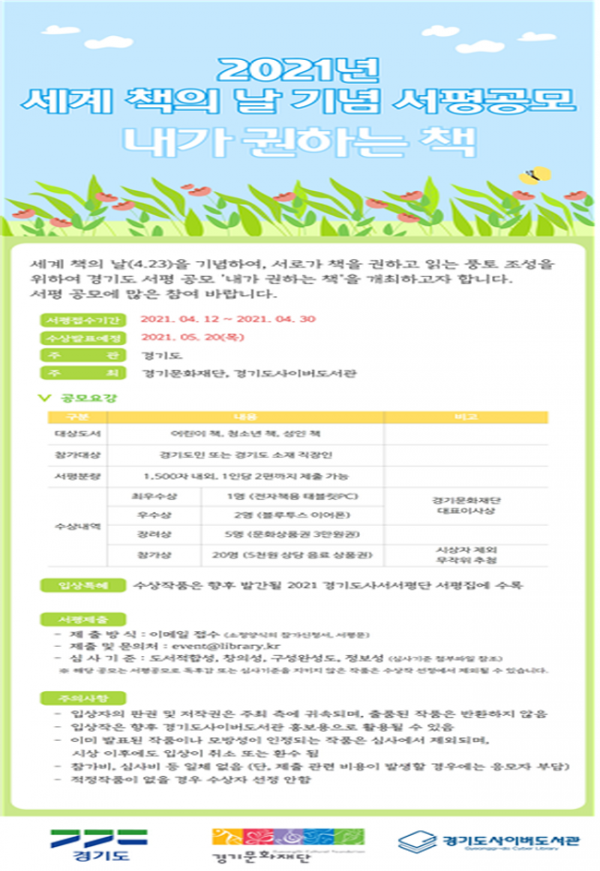 경기도가 도서관 주간과 세계 책의 날을 맞아 ‘내가 권하는 책 서평공모’와 경기도사이버도서관에서 운영하는 전자책에 별점과 리뷰를 작성하는 행사를 연다.