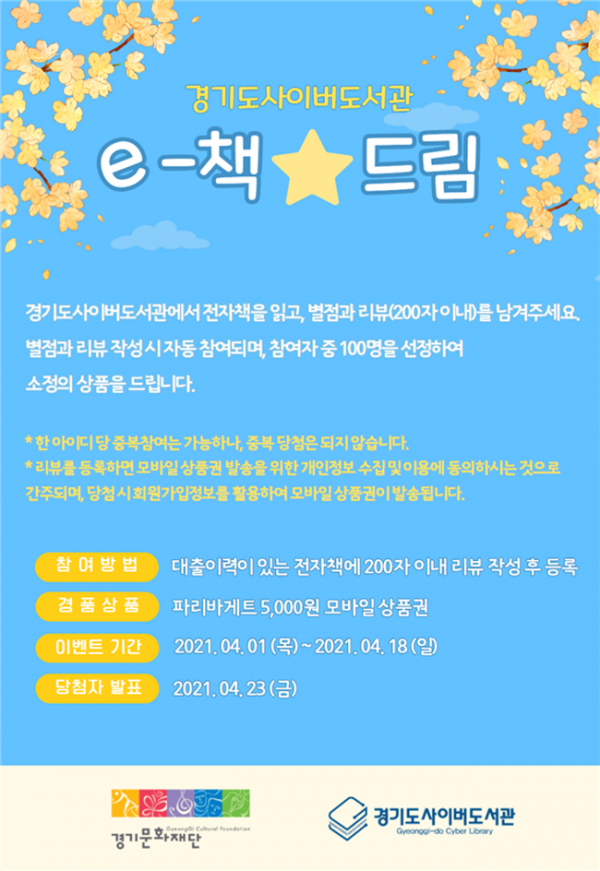경기도사이버도서관 신규 전자책 이용 활성화와 독서 생활화를 위한 ‘전자책 별점&리뷰’ 작성 행사는 4월 1일부터 18일까지 2주 간 진행한다. 경기도사이버도서관 전자책 회원을 대상으로 대출이력이 있는 전자책에 별점과 200자 내외 리뷰를 작성해 등록하면 자동으로 참여되며, 참여자 중 100명을 선정해 모바일 상품권을 제공한다.
