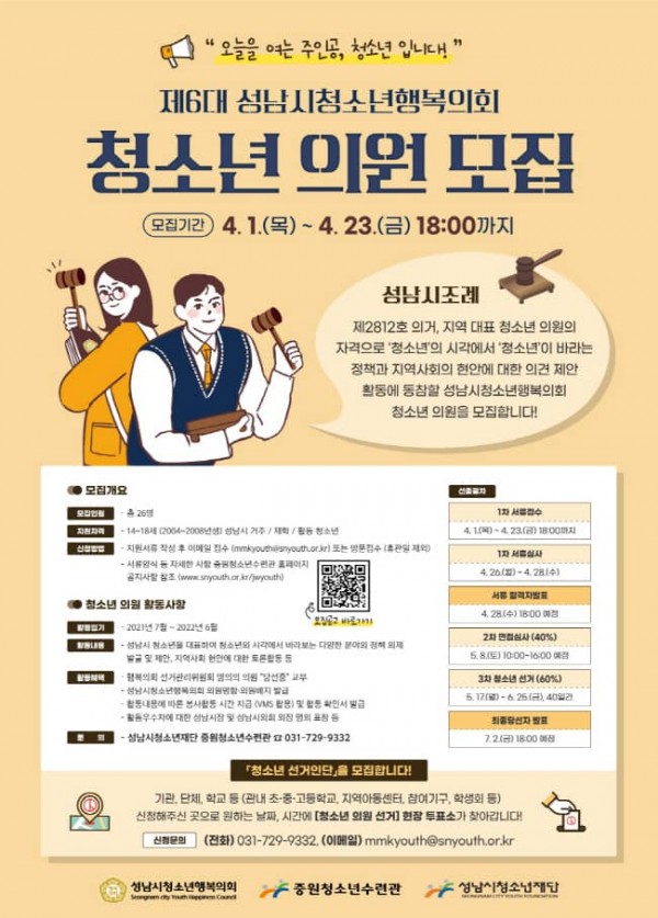 모집대상은 14세부터 18세의 성남시 거주 혹은 재학 중인 청소년이며, 4월 1일부터 4월 23일까지 1차 서류를 접수받는다.