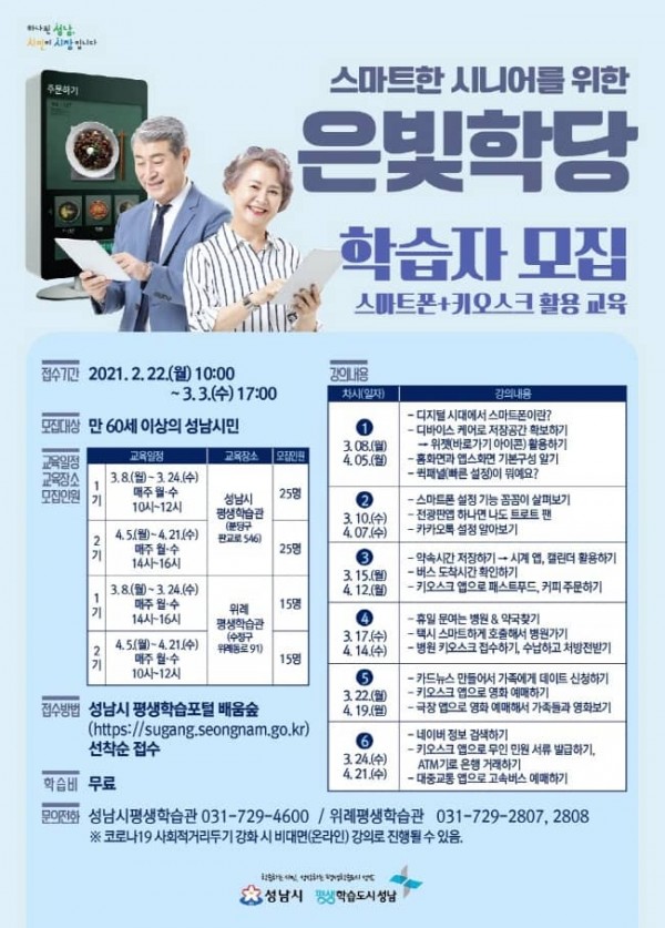 성남시(시장 은수미)는 만 60세 이상 노년층을 대상으로 야탑과 최근 개관한 위례 평생학습관에 ‘은빛학당’을 개설한다. 이 ‘은빛학당’ 첫 프로그램으로 스마트폰과 키오스크 활용 교육을 제공한다.
