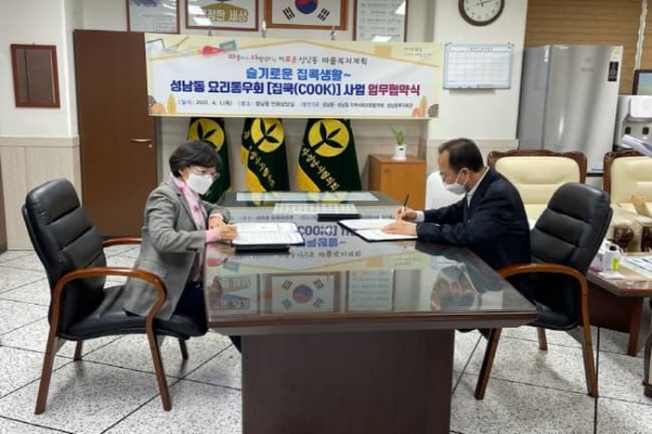 성남시 중원구 성남동 행정복지센터, 성남동 지역사회보장협의체, 성남동복지회관이 코로나19로 사회관계가 결핍된 저소득 중장년 1인 가구 남성들을 위해 업무협약을 통해 온라인 요리동우회 집쿡(COOK) 사업을 시작한다.