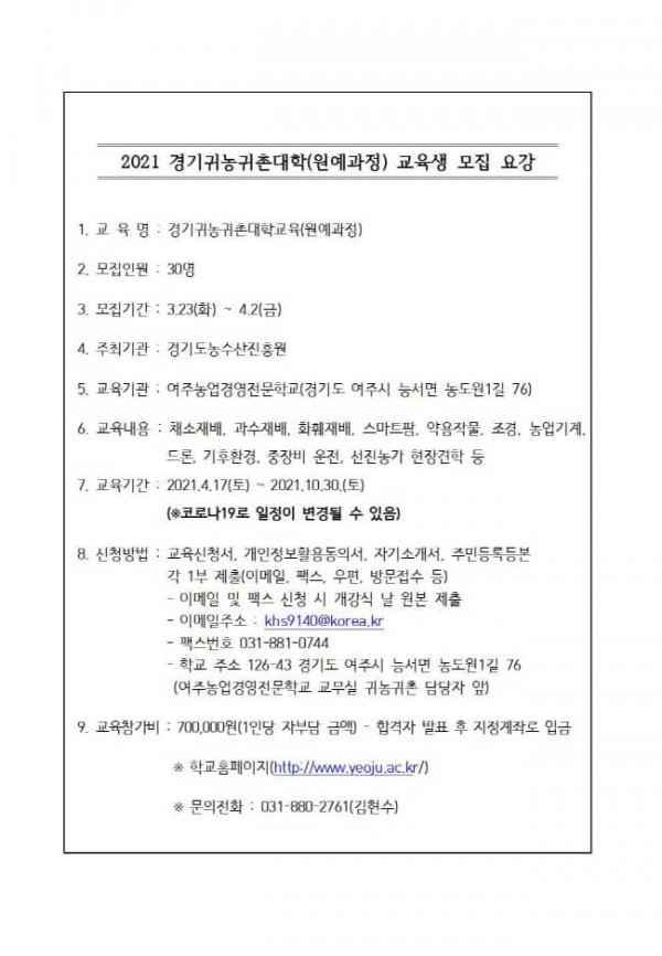 경기도농수산진흥원, ‘2021 귀농귀촌대학 교육생’ 모집