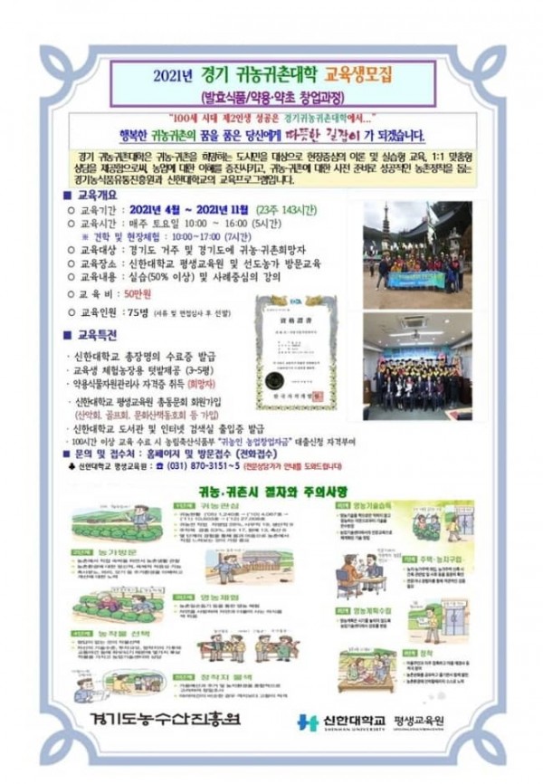 농협대학교(고양시) 105명, 신한대학교(의정부시) 75명, 여주농업경영전문학교(여주시) 30명 등 총 210명을 모집하며 선정된 사람에게는 교육비의 50%인 70만 원을 지원한다. 교육 수료자에게는 농림축산식품부가 주관하는 ‘귀농 농업창업 및 주택구입 지원사업’ 신청 자격도 부여된다.