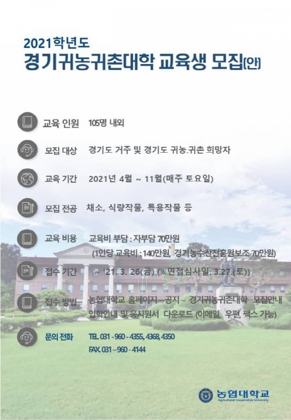 경기도와 경기도농수산진흥원이 운영하는 경기도귀농귀촌지원센터가 ‘2021 귀농귀촌대학’ 참여 교육생을 모집한다.