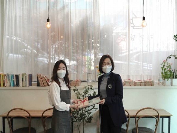 은수미 성남시장(오른쪽)이 3월 25일 중원구 은행동 카페담담에 ‘도서관 너머 동네카페 인증 현판’ 전달했다