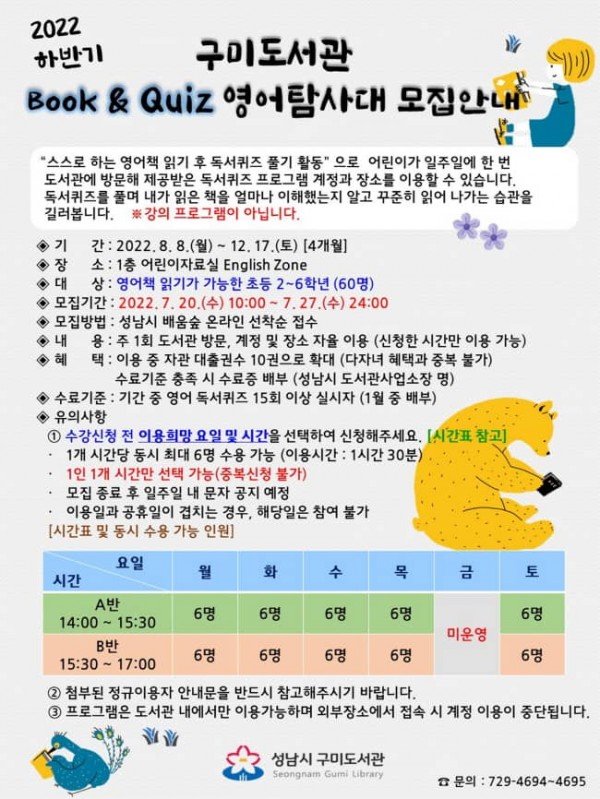 성남시 구미도서관은 오는 7월 20일부터 27일까지 어린이 영어독서 프로그램인 ‘북앤퀴즈 영어탐사대’ 참여 희망자 60명을 모집한다.