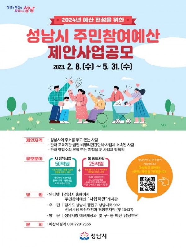 성남시는 내년도 예산 편성을 위해 오는 5월 31일까지 ‘주민참여예산 제안사업’을 공모한다.