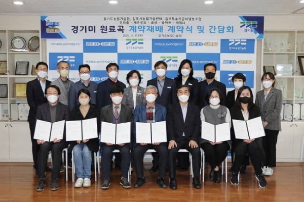 경기도농업기술원이 17일 화성 농기원에서 도내 5개 쌀 가공업체와 ‘경기미 원료곡 계약재배를 위한 계약식 및 간담회’를 가졌다.