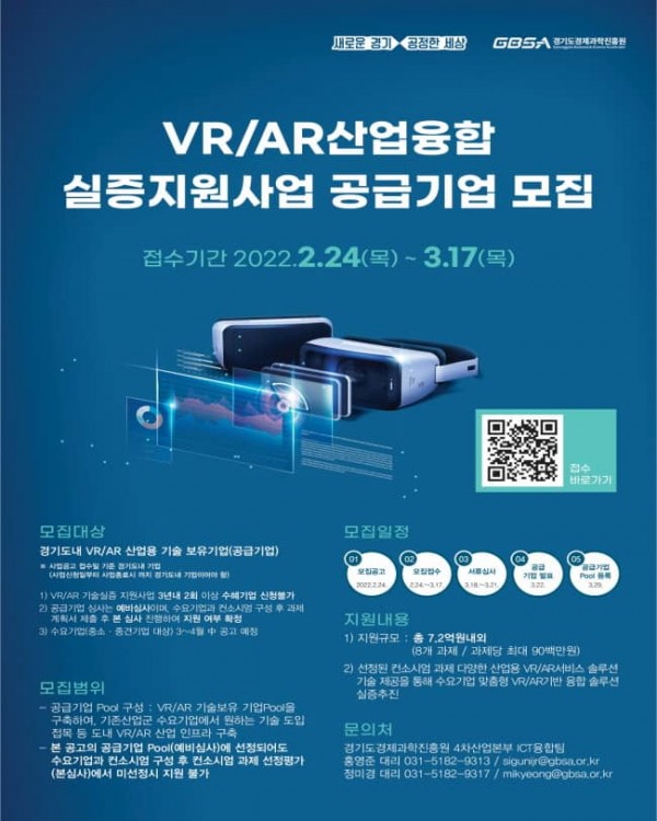 ○ 도, ‘VR/AR 산업융합 실증 지원’ 사업 참가기업(공급기업) 3월 17일까지 모집