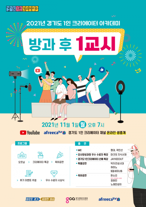 우선 11월 11일 오후 7시 열리는 ‘방과후 1교시’에서는 올해 경기도 1인 크리에이터 아카데미 교육 과정들을 함께 공유하고, 제이키아웃(구독자 144만명), 덕자전성시대(구독자 57만명), 허미노(구독자 68만명) 등 유명 스타 크리에이터들이 참여하는 특강을 진행한다. 아카데미 수강생들의 특별공연과 우수 크리에이터(수강생) 발표 등도 예정됐다.