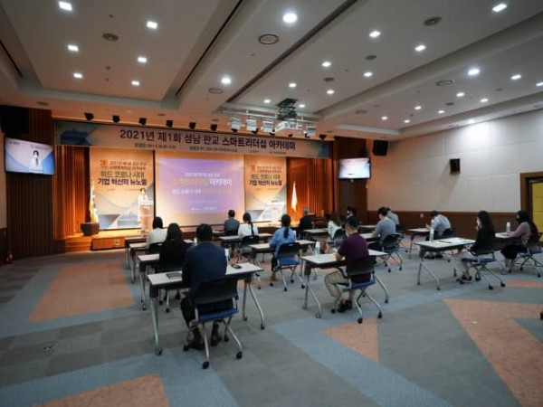 성남산업진흥원은 2021년 제1회 ‘성남 판교 스마트리더십 아카데미’를 28일 비대면으로 개최하고 위드 코로나 시대 불확설성 극복과 성장 정체 탈피 방안을 성남 소재 기업들과 공유했다.