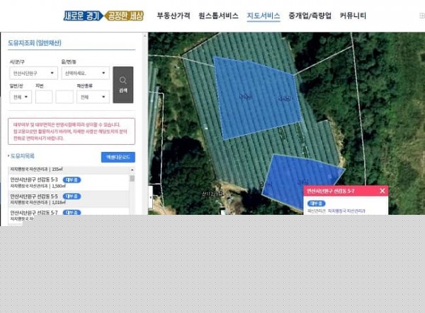 경기도 부동산정보사이트 ‘경기부동산포털’(gris.gg.go.kr)이 9일부터 신규 서비스로 ‘도유지 정보지도’와 ‘농산물 생산지도’를 제공한다.