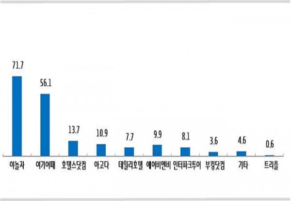 숙박업체별로 가장 많이 사용하는 앱은 야놀자 85.0%, 여기어때 73.2%, 네이버플레이스 20.6% 등의 순이었는데 숙박업체는 이용률 상위 3개 숙박앱에 월평균 163만 원을 중개수수료로 지불하는 것으로 나타났다. 예약 건당 평균 수수료율은 11.3%다.