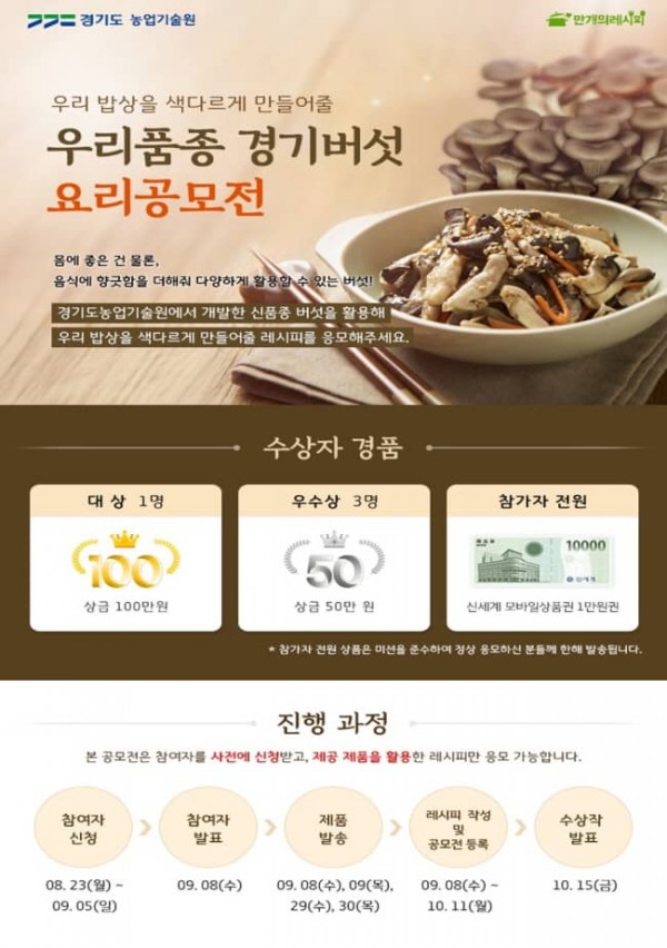 경기도농업기술원이 자체 개발한 우리품종 버섯의 다양한 활용법을 제시하고 소비를 촉진하기 위해 요리 공모전을 개최한다.