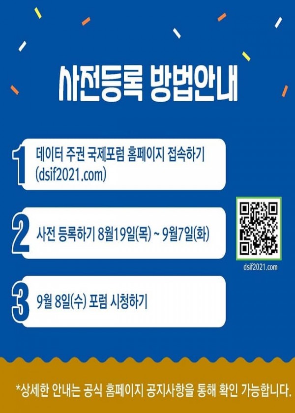 19일부터는 국내외 참여 기관들의 사례를 들어볼 수 있는 ‘데이터 주권 웨비나’와 본 행사인 ‘데이터 주권 국제포럼’ 온라인 참여자를 모집하는 ‘사전등록 이벤트’를 실시한다. 사전등록은 행사 홈페이지(www.DSIF2021.com)에서 무료로 등록할 수 있으며, 등록한 사람에게는 웨비나와 행사에 참여할 수 있는 링크주소를 이메일이나 문자 메시지로 제공한다.