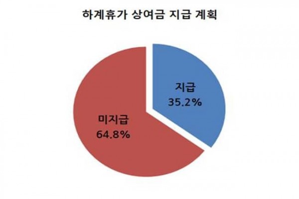 휴가비(상여금)를 지급하는 기업(35.2%)의 경우, 기본급 대비 50%미만 지급(24.6%), 50%이상~100%미만 지급(17.5%), 100%이상 지급(5.3%) 순으로 지급할 예정이며, 일정 금액으로 지급(52.6%) 예정인 기업은 평균 45만 3천 3백원인 것으로 조사되었다.