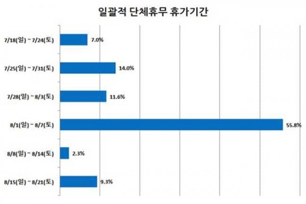일괄적 단체휴무의 경우 7월 18일부터 8월 21일까지 하계 휴가를 계획하고 있으며, 휴무기간은 8월 1일부터 8월 7일까지 시행하는 기업의 응답이 55.8%로 가장 많았고, 7월 25일부터 7월 31일까지 14.0%, 7월 28일부터 8월 3일까지 11.6% 순으로 휴무일은 평균 4.4일로 나타났다.