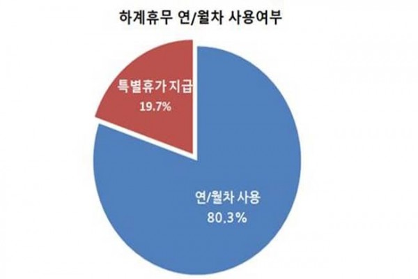 기간 정함이 없는 연중 휴가를 계획하고 있는 사업장의 경우 80.3%(118개사)가 연중 개인 연/월차 소진 휴무를 시행하고, 그 외 19.7%(29개사)의 경우 하계 특별휴가를 별도 지급한다.