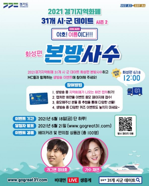 경기지역화폐를 알리기 위한 비대면 행사인 ‘경기지역화폐 31개 시군 데이트’(부제: 야호! 여름이다!!!)가 18일 화성 전곡항에서 시즌2 시작을 알렸다.