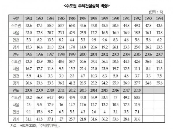 연구원은 이처럼 중앙 주도의 주택정책 구조에서 정부가 주택문제 발생 시 분권화 전략보다 수도권 대규모 택지개발을 택하며, 수도권 비대화를 초래했다고 지적했다. 1982~2018년 전국 대비 수도권 주택건설실적 비중은 2009년 최고 66.8%를 기록하는 등 대부분 50% 안팎을 유지했다. 특히 1기 신도시 입주 시기(1990~1995년)에는 수도권 인구 증가율이 전국 인구 증가율의 3.12배에 달하기도 했다.