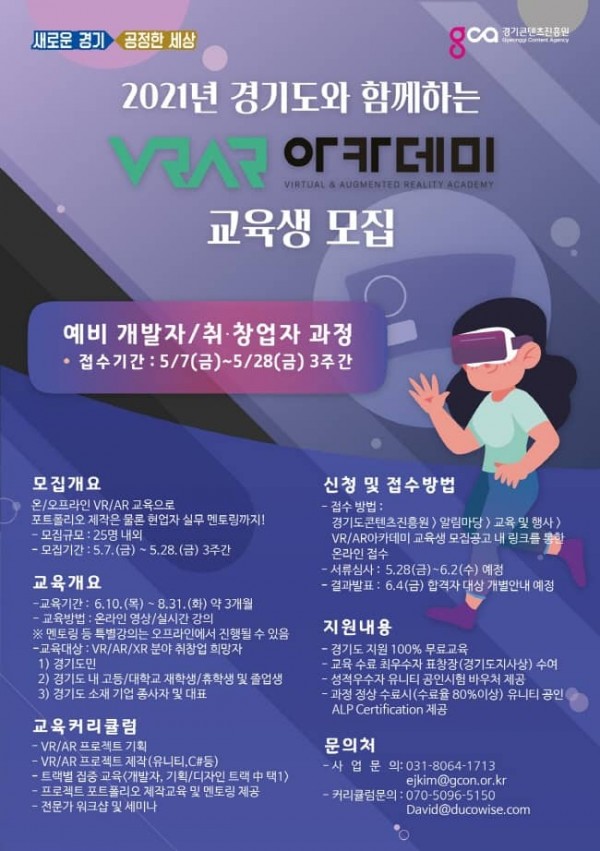 경기도는 가상/증강현실을 포함한 확장현실 실감기술(VR/AR/XR) 전문인력 양성을 위한 ‘2021년 VR/AR 아카데미’를 개강하고, 취·창업과정 교육생을 오는 28일까지 모집한다고 11일 밝혔다.