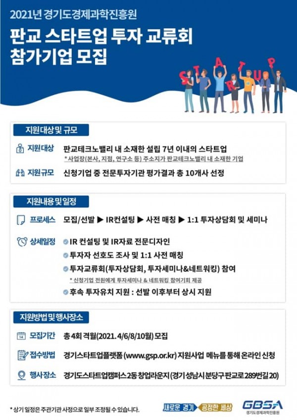 ‘투자 교류회’에 대한 자세한 내용은 경기도경제과학진흥원 창업진흥TF팀(031-8039-7106)으로 문의하면 된다.